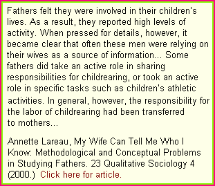 Fact: "The 'new father' remains more fiction than fact. Apparently the culture of fatherhood has changed but not the practice. Only a few studies report increases in paternal involvement in recent decades. The few men who do increase their parental activity do so mostly in the area of play -- not assuming a full range of parenting responsibilities. Men and women in middle-class famillies use different standards to measure and explain away fathers' limited involvement in parenting, thus sustaining the myth of egalitarianism. As they do with household labor, wives tend to underestimate their parenting activity, and husbands tend to overestimate theirs."